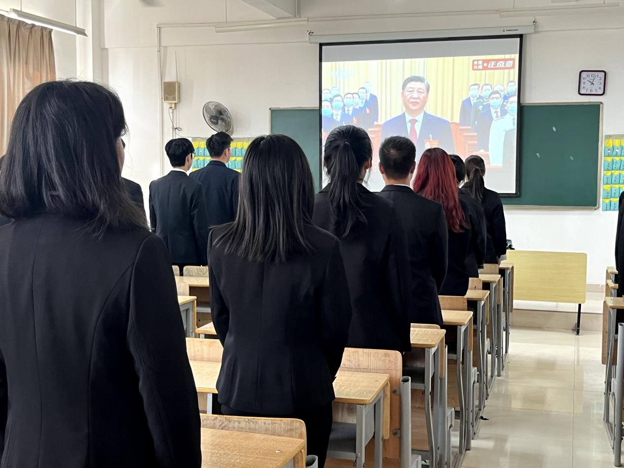 开幕式奏唱国歌时,全体学生组织工作人员起立,与各位人大代表一同昂首肃立高唱中华人民共和国国歌,共同见证这一历史性时刻。随后,李克强同志说,“让我们怀着十分崇敬的心情,为毛泽东、周恩来、刘少奇、朱德、邓小平、陈云等已故老一辈无产阶级革命家和革命先烈默哀”。话毕,同学们一同为革命先烈默哀。在观看过程中,大家全神贯注,以饱满的精神面貌和昂扬的精神状态聆听习近平总书记在开幕式上作的报告,并专心致志做笔记。