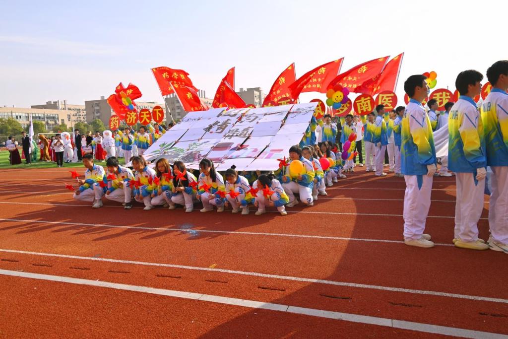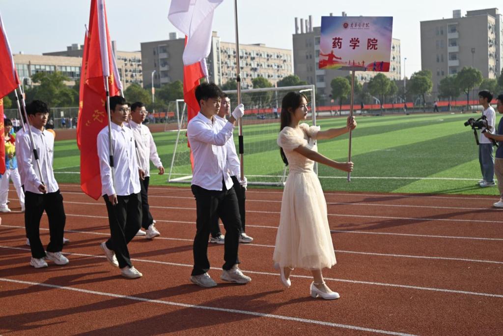 开幕式上,yL23411永利集团代表方阵踏着整齐的步伐走在火红的跑道上,独特的青春风采展现在他们的脸庞上。他们喊着响亮的口号“药济天下,学贯中西;筑梦南医,强我中华”,在主席台前展现出药苑学子奋发向上的精神面貌。