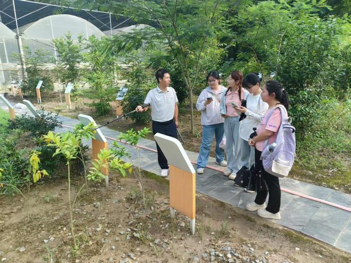 6月30日,研学从药圣广场启程。据江西省中医药研究院陈超老师介绍,中医药文化科普基地由种植品种展示园与种质资源保存圃构成,是“政府赠地、研究院育苗、景区护园”的合作成果,其中种植园占地7亩,种植药材70余种。漫步园内,栀子青果如翡翠,决明黄花似金盏,三叶木通藤蔓翩跹。陈超老师讲述车前草经三年选育成为药典药材的驯化历程,揭秘华东覆盆子与汇仁肾宝片、夏枯草与王老吉的关联。学子们还学会区分节节草与木贼,了解竹子不同部位的药用价值及葛根“一材多能”的特性。