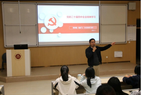 刘永飞书记则以全会精神为纲领,系统阐释了党的二十届四中全会召开的关键时代节点——处于“十四五”目标任务即将胜利完成、“十五五”规划谋划布局的承前启后阶段,深刻剖析了这一时期我国发展环境的复杂变化与经济基本面稳、优势多、韧性强的总体特征。他紧扣教育、科技、人才强国建设战略要求,结合国家GDP增长态势与世界经济格局,着重解读了新质生产力的核心内涵与发展路径,强调药学学子要立足专业,在AI辅助药物设计、靶向药研发等前沿领域主动作为,将个人理想深度融入国家现代化产业体系建设的大局之中。同时,他围绕“五位一体”总体布局、“四个全面”战略布局等重要论述,为学子明晰了新时代药学人才的成长坐标。