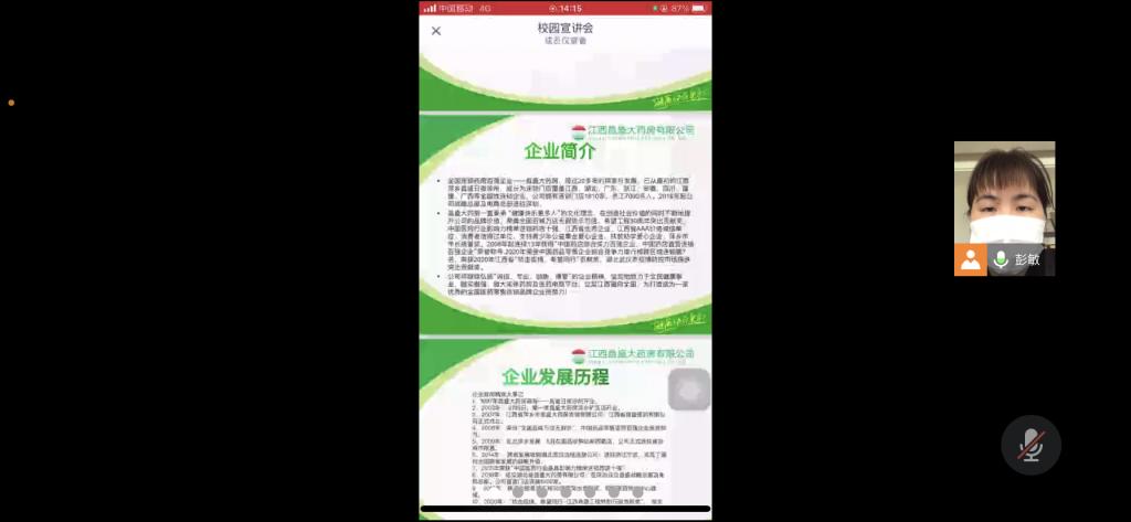 为进一步引导毕业生做好实习工作,推动实习工作的顺利开展,药学系于2022年4月26日星期二下午1点30分至3点左右在线上举办了杭州金膳祥生物科技、昌盛大药房连锁有限公司招聘宣讲会,吸引了众多毕业生积极参加此次招聘活动。