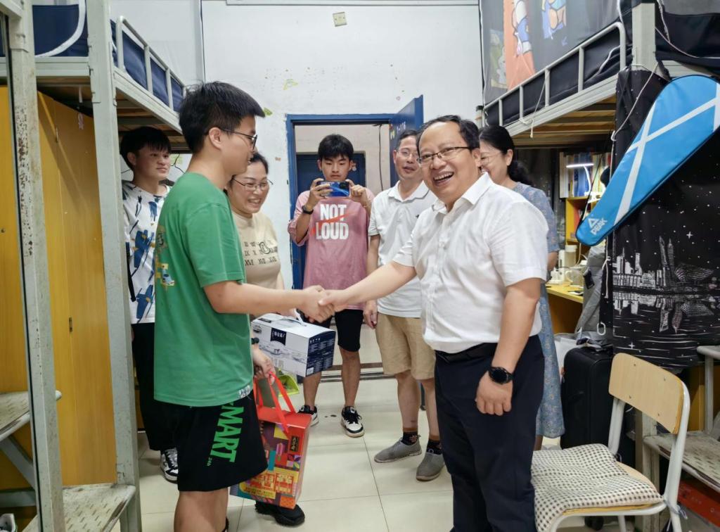 在学生宿舍,叶耀辉代表学校给困难学生送上粽子、牛奶等慰问品,提前送上端午的节日祝福,把党和国家及学校的温暖关怀传递到困难学生心中。叶耀辉与同学们亲切交谈,询问在生活和学习的情况,了解学生对于未来学习、生活的计划与期待,勉励他们在党和政府资助政策的扶持下,坚定信心,自立自强,战胜困难,奋发图强,练就过硬本领,奉献国家。同学们对学校关心表示感谢,纷纷表示,会勇敢面对逆境,以自强自信、积极向上的健康心态面对未来,争取早日用学到的知识和本领回报!