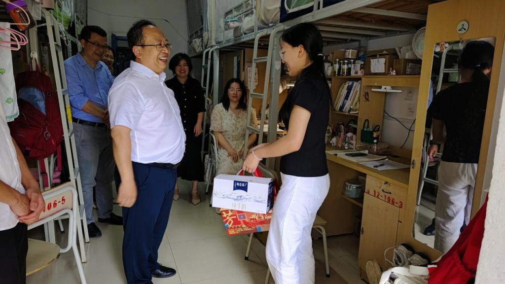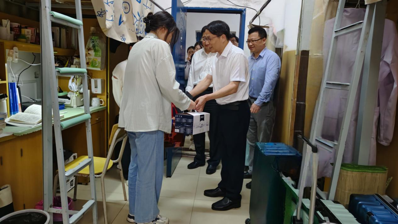 在宿舍的走访过程中,李秋根与我院学子亲切交谈,详细询问学习、生活情况,了解她们在校园生活中遇到的问题和困难,为同学送上端午节的祝福和精心准备的慰问品,鼓励同学克服困难,自立自强,让同学在学校也能感受到浓浓的节日氛围和关爱。