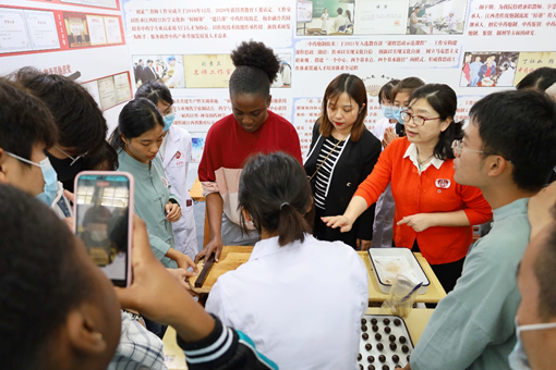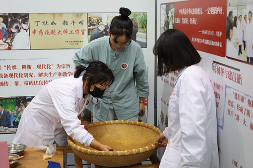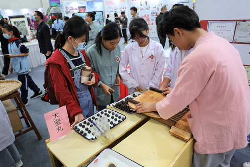 中药传统手工制剂水泛丸是由水和药粉为主通过在药筛上反复旋转成小丸,水丸使用的赋形种类繁多,包括酒、醋、稀药汁等。大蜜丸主要是将中药打成粉末,用蜂蜜作为粘合剂制成的丸剂。在展会上通过学生现场制作水泛丸、大蜜丸,吸引了许多高校教师和学生驻足观看和学习。