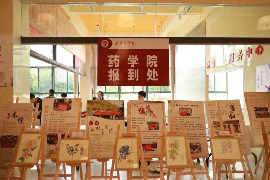 迎新现场展示了学生手绘中药图和暑期社会实践材料(谢子然/摄)