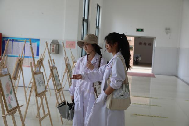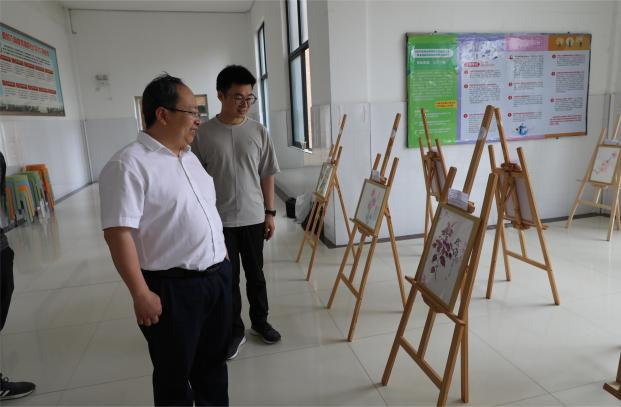 叶耀辉、胡振宇认真参观中药绘画作品后,对同学们能将课堂理论与中药种植劳动实践相结合,汲取灵感,用画笔展现中药之美给予充分肯定。并指出,要充分发挥劳动教育之树德、增智、强体、育美的综合育人价值,积极探索和优化与专业紧密结合的劳动教育途径。