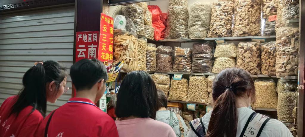 7月13日,调研小队来到清平药材市场进行实地考察。参观药市,观察和了解到中药材市场已经形成了一定规模,各种中药材种类繁多,品种齐全,从动植物到矿物都有涉及。通过实地观察和接触,队员更加深入地了解各种中药材的外观、质地、香味以及特殊功效等。通过与店主和经销商们交谈,深入了解到当地特色中药材例如陈皮,化橘红等的来源和去向,记录了各类药材的主要来源,交易方式,销量和价格波动等。例如最近一个月内,当归价格持续飚高,从原来的80元一斤涨到200元一斤。通过对药市的调研,有效获取相关行业动态和市场信息,记录下不同种类的药品在市场上的供需情况,对药市的运作机制和市场需求有更深刻的认识。