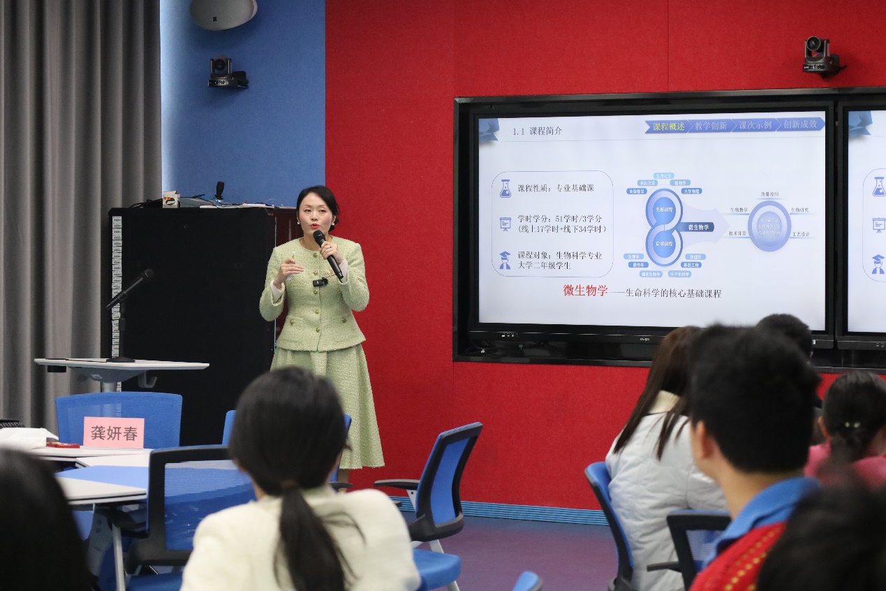 龚妍春教授作《见“微”知著,催“生”创新——数字化赋能背景下的高校课程建设》报告(徐晶颖/摄)