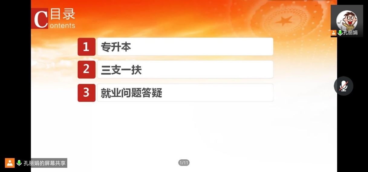 讲座伊始,孔老师从专升本、三支一扶、就业问题答疑这三个面展开讲述。近几年,国家出台了一系列优惠政策鼓励高校毕业生积极参加社会主义新农村建设、城市建设和应征入伍,孔老师向大家详细的介绍了“大学生志愿服务西部计划”“三支一扶”等目前国家引导高校毕业生基层就业政策,同学们也陆续提出了自己对于就业政策的疑问,孔老师对这些问题进行了详细的解释。